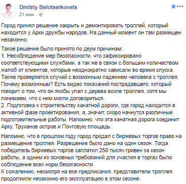 Напомним, 25 мая при переправе на канатной дороге через Днепр травмировался человек. Об этом сообщали очевидцы в Facebook. Поездка на тросе от арки Дружбы Народов к Трухановому острову чуть не стоила человеку жизни. Трос оборвался, и человек упал на песок.