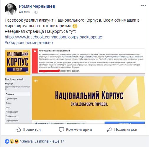 Соцсеть Facebook удалила аккаунт политический партии "Национальный Корпус", лидером которой является основатель "Азова", народный депутат-мажоритарщик Андрей Билецкий.