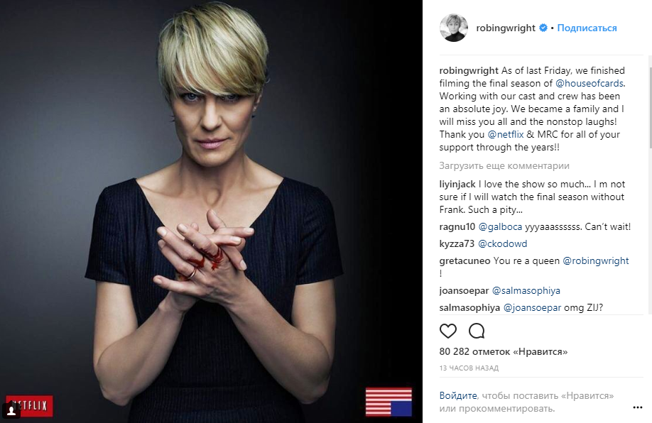 "В прошлую пятницу мы закончили снимать последний сезон "Карточного домика". Работа с нашими актерами и командой была абсолютной радостью. Мы стали семьей, и я буду скучать по всем вам", - написала актриса.