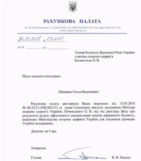 Заместитель Министра здравоохранения Украины Александр Линчевский во время выступления в Счетной палате Украины заявил, что средства на лечение онкобольных украинцев за рубежом, выделять нецелесообразно, поскольку четверть пациентов все равно умрут.