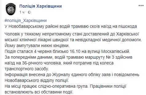 Как отмечается, после наезда мужчина выжил, и был в тяжелом бессознательном состоянии доставлен в Харьковскую городскую клиническую больницу скорой и неотложной медицинской помощи, где ему ампутировали нижние конечности.