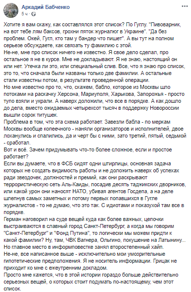 "Хотите я вам скажу, как составлялся этот список? По Гуглу. "Пивоварник, на вот тебе лям баксов, грохни пяток журналюг в Украине". "Да без проблем. Окей, Гугл, кто там у бандер что пишет". А вы тут на полном серьезе обсуждаете, как связать ту фамилию с этой. Не-не, мне про список ничего не известно. Я свое дело сделал, про остальное я не в курсе. Мне не докладывают. Я не знаю, настоящий он или нет. Утечка ли это, или специальный слив. Все, что я знаю про список, это то, что сначала были названы только две фамилии. А остальные стали известны потом, в результате проведенной операции.