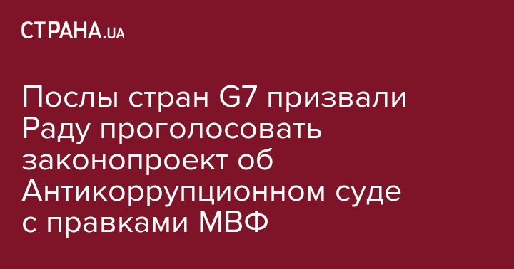 Послы стран "Большой семерки" (G7) призвали депутатов Верховной Рады проголосовать в целом за законопроект о создании независимого Антикоррупционного суда в Украине.