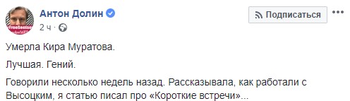 "Умерла Кира Муратова. Лучшая. Гений. Говорили несколько недель назад. Рассказывала, как работали с Высоцким, я статью писал про "Короткие встречи", - поделился журналист Антон Долин.