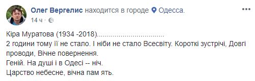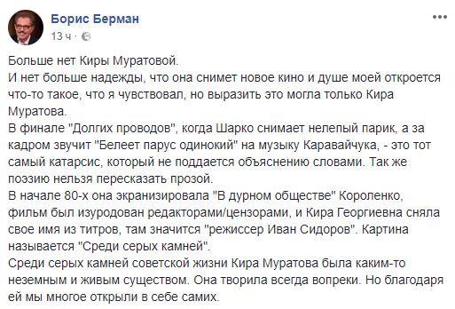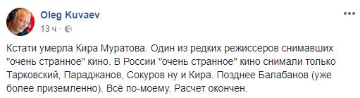 Режиссер и мультипликатор Олег Куваев: "Умерла Кира Муратова. Один из редких режиссеров, снимавших "очень странное" кино. В России "очень странное" кино снимали только Тарковский, Параджанов, Сокуров ну и Кира. Позднее Балабанов (уже более приземленно). Всё, по-моему. Расчет окончен.
