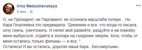 Блогер Ирина Медушевская: "О, ни Президент, ни Парламент не осознали масштаба потери... Но Кира Георгиевна это предвидела: "Дневники и все, что когда-то писала, хочу сжечь, уничтожить. И пепел мой развейте, раздуйте и на помойку меня выбросьте, отдайте в зоопарк на съедение зверям. Хочу, чтобы от меня остались только фильмы — и все".