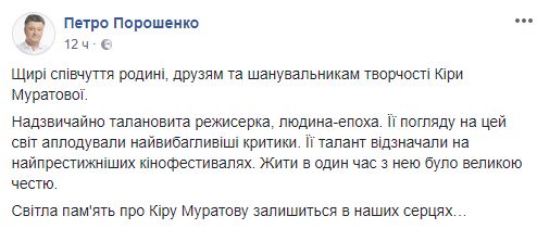Свои соболезнования выразил президент Украины Петр Порошенко. "Искренние соболезнования семье, друзьям и поклонникам творчества Киры Муратовой. Очень талантливая режиссер, человек-эпоха. Ее взгляда на этот мир аплодировали самые критики. Ее талант отмечали на самых престижных кинофестивалях. Жить в одно время с ней было большой честью. Светлая память о Кире Муратовой останется в наших сердцах ..." – написал он.