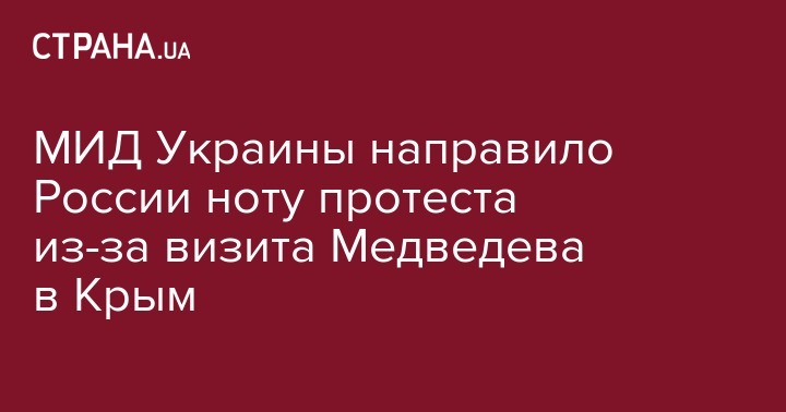 Пребывание на временно оккупированной территории Крыма председателя российского правительства Дмитрия Медведева, предварительно несогласованное с украинской стороной, вызвало негодование в МИД Украины, которое отправило ноту протеста российскому внешнеполитическому ведомству. Об этом сообщается на официальном сайте МИД Украины.