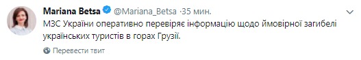 Министерство иностранных дел Украины оперативно проверяет информацию о возможной гибели украинских туристов в горах Грузии. Об этом на своей странице в Twitter написала пресс-секретарь МИД Марьяна Беца.