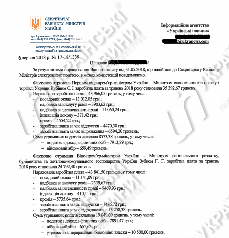 Зарплата первого заместителя вице-премьера Вячеслава Негоды составила 160 400 гривен, заместителей Эдуарда Кругляка - 52 900 гривен, Льва Парцхаладзе - 44 900 гривен, Тараса Токарского - 53 600 гривен и госсекретаря Максима Малашкина - 73 500 гривен.