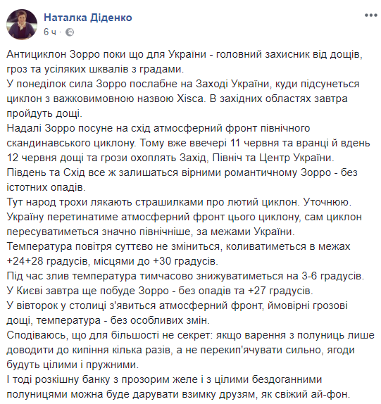 "В дальнейшем Зорро двинет на восток атмосферный фронт северного скандинавского циклона. Поэтому уже вечером 11 июня, а также утром и днем ​​12 июня дожди и грозы охватят Запад, Север и Центр Украины. Юг и Восток все же останутся верными романтическому Зорро - без существенных осадков", - предупреждает Диденко.