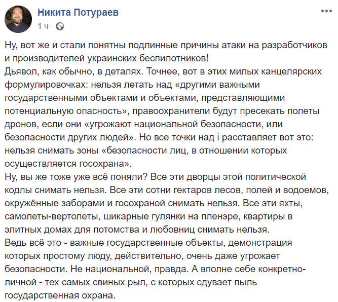 Ведь всё это - важные государственные объекты, демонстрация которых простому люду, действительно, очень даже угрожает безопасности. Не национальной, правда. А вполне себе конкретно-личной - тех самых свиных рыл, с которых сдувает пыль государственная охрана", - пишет общественный деятель Никита Потураев.