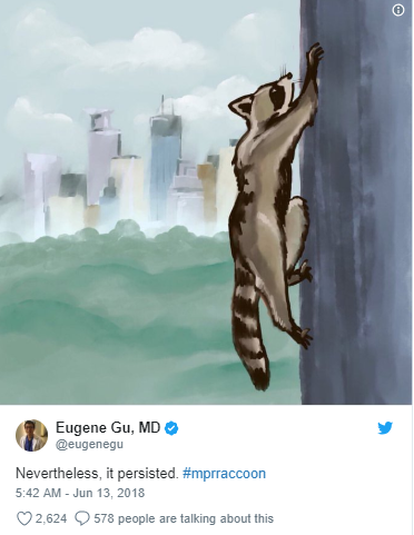 Фотожурналист MPR Эван Фрост заметил енота на выступе первого этажа примерно в 8.30 утра. Об этом он написал в Twitter. Вместе с коллегами они попытались спустить енота, приставив к стене доски, однако животное решило карабкаться вверх.