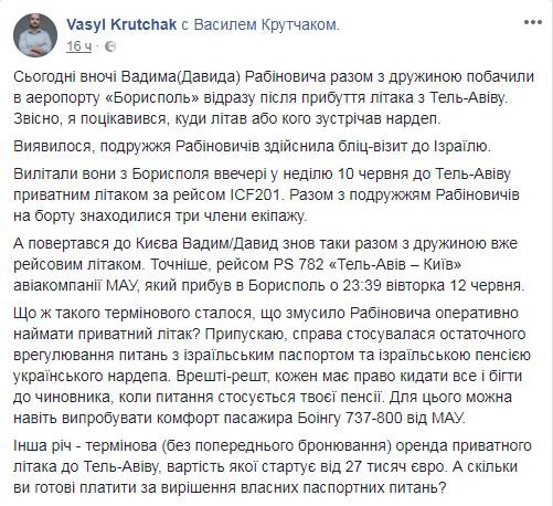"Сегодня ночью (12 июня) Вадима (Давида) Рабиновича вместе с женой увидели в аэропорту "Борисполь" сразу по прибытии самолета из Тель-Авива. Конечно, я поинтересовался, куда летал или кого встречал нардеп. Оказалось, супруги Рабинович осуществили блиц-визит в Израиль", - написал блогер.