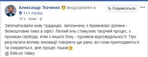 "Внедрили новую традицию, заимствованную из Кремниевой долины - бесплатное пиво в офисе. Легкий эль стимулирует творческий процесс, является проявлением свободы, однако с другой - проявлением ответственности. О результатах влияния инновации говорить еще рано, все пока присматриваются и оглядываются, но процесс пошел", - отметил топ-менеджер телеканала и подкрепил свои слова фотоотчетом из буфета компании.