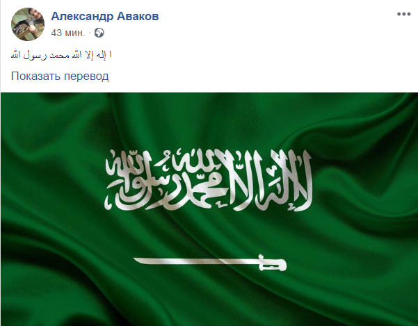 16:57  Сын главы МВД Александр Аваков явно будет смотреть мундиаль. У себя в Facebook он опубликовал знамя Саудовской Аравии, с которой Россия начнет играть через час.