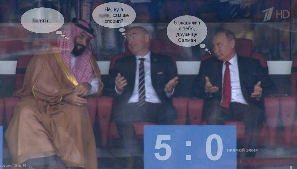 21:12  "Пять скважин с тебя, дружище Салман". Так пользователи представляют себе разговор Путина и короля Саудовской Аравии в ложе стадиона Лужники.
