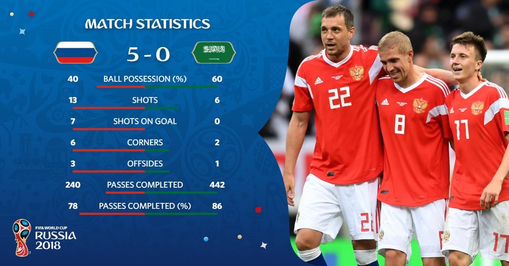18.40 Вроде как и лучше смотрится Россия, но по владению мячом статистика удивительная - 42/58, то есть мячом больше владеют гости. Есть мнение, что если против Саудовской Аравии играют подопечные Черчесова вторым номером, то против Египта и Уругвая попробуют тоже. Только не факт, что получится - там сильнее исполнители.