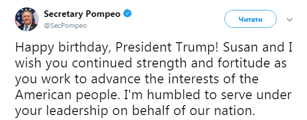Сегодня же с самого утра 45-го президента США поздравил оссекретарь Помпео со своей супругой Сьюзан. Он пожелал президенту Трампу силы и стойкости в работе над продвижением интересов американского народа.