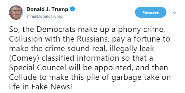 Таким образом, представители Демпартии создают фальшивое преступление, сговор с русскими, платят целое состояние, чтобы заставить его казаться реальным, (организуют - Прим.Ред.) незаконную утечку секретной информации Коми (экс-главы ФБР - Прим.Ред.) , чтобы назначить специальный совет, а затем сговариваются, чтобы эту кучу мусора вылили в жизнь в фейковых новостях!