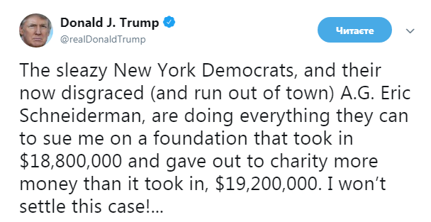 "Теперь, когда я вернулся из Сингапура, где мы достигли отличного результата в отношении Северной Кореи, должен с грустью вернуться к "Охоте на ведьм", всегда помня о том, что не было никакого сговора и никаких помех (расследованию - Прим.Ред.) сфабрикованного Не преступления