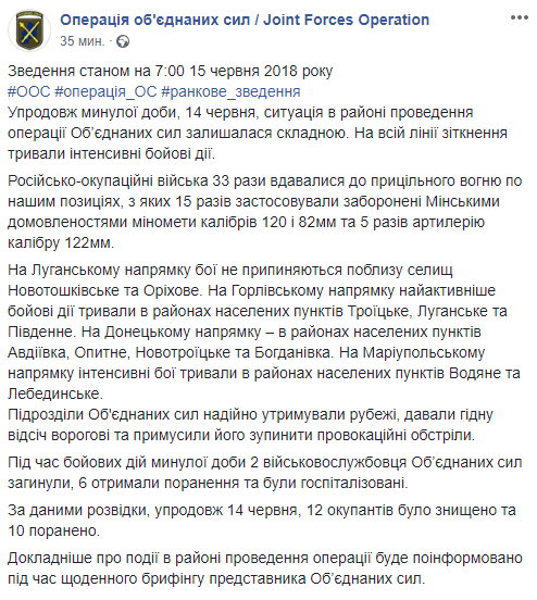 За прошедшие сутки, 14 июня, ситуация в районе проведения операции Объединенных сил оставалась сложной. На всей линии соприкосновения продолжались интенсивные боевые действия.