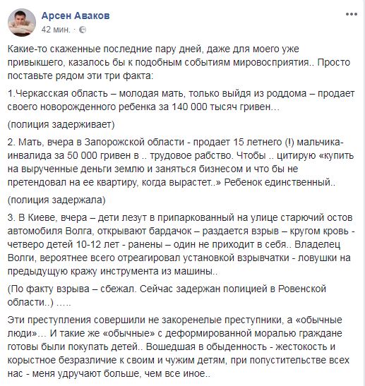 "В Киеве, вчера - дети лезут в припаркованный на улице старючий остов автомобиля "Волга", открывают бардачок - раздается взрыв - кругом кровь - четверо детей 10-12 лет - ранены - один не приходит в себя... Владелец "Волги", вероятнее всего отреагировал установкой взрывчатки-ловушки на предыдущую кражу инструмента из машины", - отметил министр.