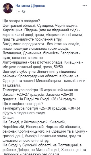 "Центральные области, Сумщина, Черниговщина, Харьковщина, юг (но не юго-восток) - кратковременные дожди, грозы, местами сильные ливни, град и шквалистое усиление ветра. Запад может передохнуть - без существенных осадков, лишь кое-где локальных немного дождей. Луганщина, Донетчина , большинство Запорожье - сухо, солнечно, жарко. Житомирщина - без существенных осадков. Киевщина - местами локальные дожди, гроза, 50/50 ", - отметила она.