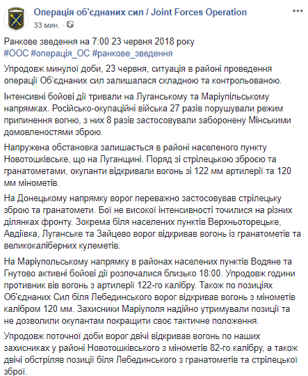 За прошедшие сутки на Донбассе зафиксировано 27 обстрелов. Об этом сообщает пресс-центр штаба ООС в Facebook.