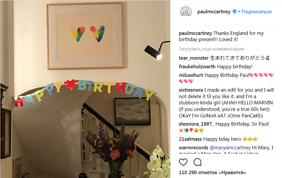"Англия, спасибо за подарок на день рождения! Мне очень понравилось!" - написал Маккартни в своем Instagram.