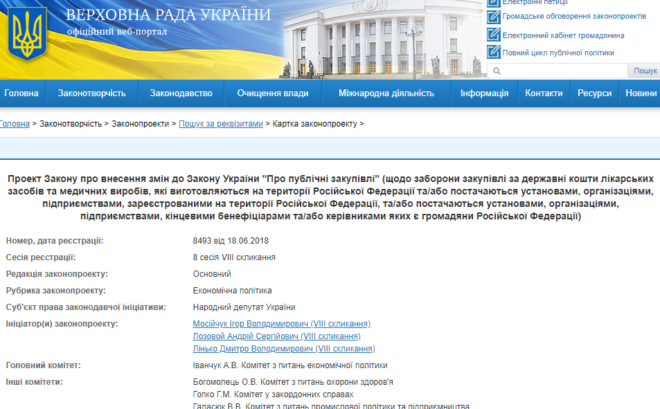 Проект закона о внесении изменений в закон Украины "О публичных закупках" (относительно запрета закупки за государственные средства лекарственных средств и медицинских изделий, изготавливаемых на территории Российской Федерации) зарегистрирован 18 июня.