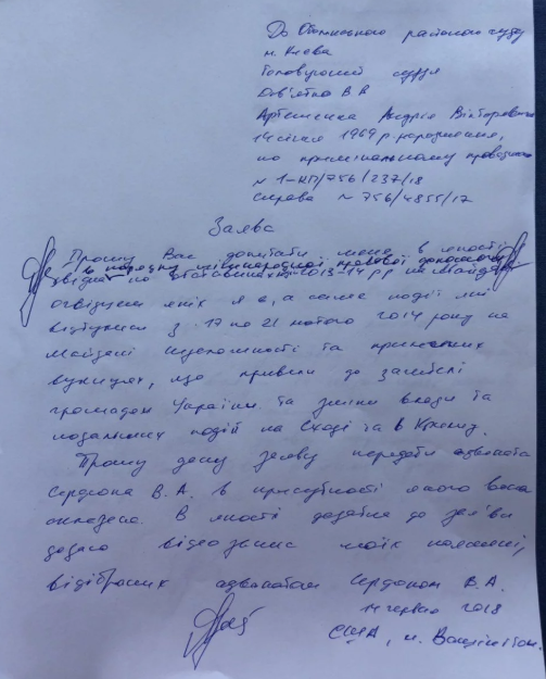 Адвокат также опубликовал соответствующее заявление Артеменко.