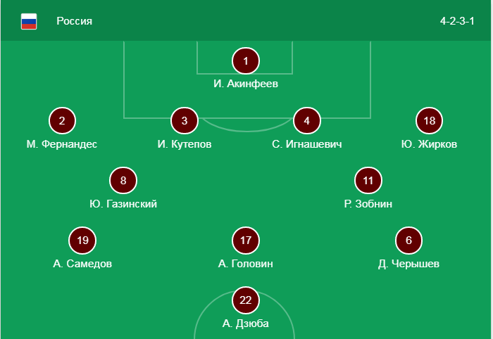 Россия: Акинфеев - защита Фернандес, Игнашевич, Кутепов, Жирков - полузащита Газинский, Зобнин Самедов, Головин, Черышев - нападение Дзюба