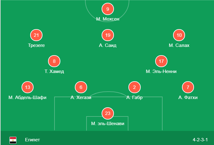 Египет: Эль-Шенави - защита Фатхи, Хегази, Габр, Абдель-Шафи - полузащита Эльнени, Хамед, Салах, Эль Саид, Трезеге - нападение Мохсен