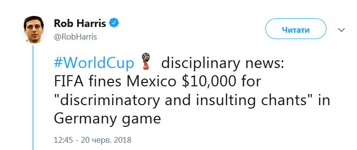 В Международной федерации футбола (ФИФА) не стали тянуть с долгим разбирательством поведения мексиканских болельщиков, которые скандировали гомофобные кричалки на матче против Германии.