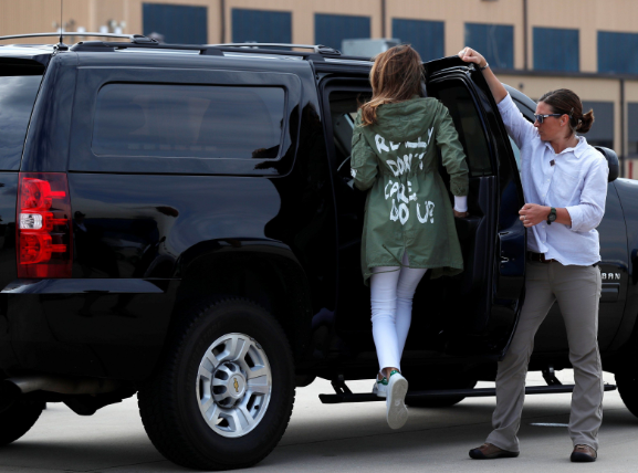 Пресс-секретарь Мелании Трамп заявила журналистам: "Здесь нет скрытого послания. После сегодняшнего важного визита в Техас, надеюсь СМИ не будут фокусироваться на ее гардеробе".