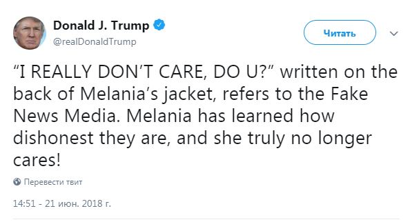 "Надпись "Меня это вообще не трогает. А вас?" на куртке Мелании касается фейковых СМИ. Мелания уже узнала, какие они нечестные, и ее это действительно больше не волнует!" - написал президент в своем Twitter.