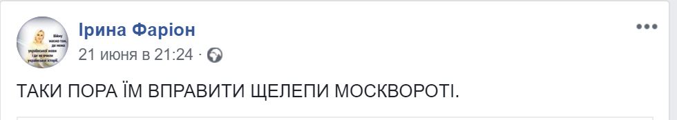 "Если бы украинцы просто ногой давали в челюсть каждому "москворотому", то война бы стала победой давно. А так пока наших бьют. А очень сильно должны бить МЫ", - пишет Фарион, комментируя инцидент с дракой в Мариуполе, где подполковнику Госпогранслужбы сломали челюсть в кафе якобы за просьбу дать меню на украинском языке.