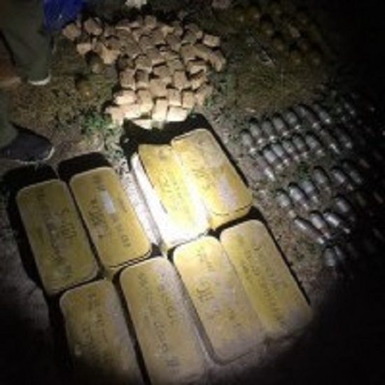 Из тайника изъяли двенадцать гранат РГД-5, одну гранату РГО, шестьдесят шесть гранатометных выстрелов к подствольному гранатомету, три гранатомета РПГ-22, пятнадцать РПГ-7, один РПГ-18, семнадцать мин 76-го калибра, большое количество патронов различного калибра, два запала к УЗРГМ, двадцать маршевых двигателей к ручному гранатомету РПГ-7, шесть сорокамиллиметровых освещаемых патронов и один сигнальный патрон.