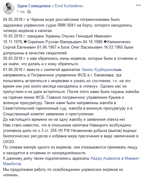 Нам стало известно, что в отношении капитана Навицкого возбуждено уголовное дело по ч.3 ст. 256 УК РФ Незаконная добыча (вылов) водных биологических ресурсов и избрана мера пресечения в виде заключения в СИЗО. По словам матери одного из моряков, они отказываются принимать пищу и находятся в отчаянии от неопределённости. К данному делу также подключились адвокаты Айдер Азаматов и Маммет Мамбетов. Мы продолжаем работу по освобождению украинских моряков из плена", - написал адвокат.