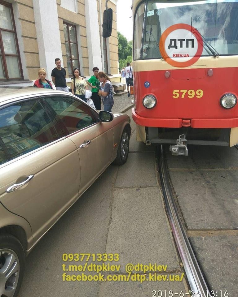 В центре Киева Jaguar на "евробляхах" заблокировал движение четырех маршрутов трамваев. Фото