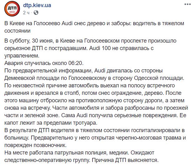 Audi 100 двигалась со стороны Демеевской площади по Голосеевскому в сторону Одесской площади. По неизвестной причине машина выехала на полосу встречного движения и врезалась в столб, потом снесла ограждение и дерево.