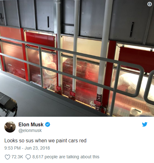 Маск показал мастерскую, где красят автомобили, и даже некоторые экземпляры Model 3 с двумя двигателями, выкрашенные в мастерской.
