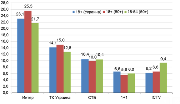 Трансляции футбольных матчей и "Большую игру" на телеканале "Интер" посмотрели 6,5 млн человек в Украине. По аудитории 18-54 (50тыс.+) "Интер" стал лидером дня на украинском телерынке с долей 13,0%.