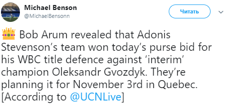 Команда Стивенсона выиграла промоутерские торги. Об этом сообщил журналист Майкл Бенсон на свой странице в Twitter.
