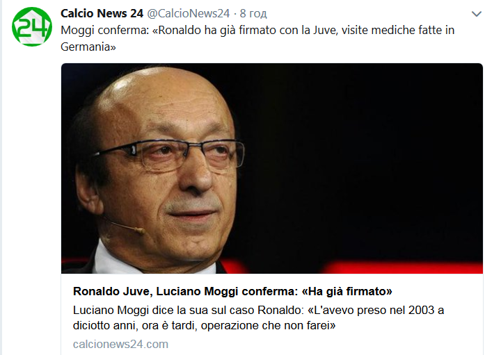 Ранее Моджи публично заявлял, что "Ювентусу" не стоит тратить 100 миллионов евро за 33-летнего форварда. Однако после этого заявления на ТВ экс-руководитель "Ювентуса" написал в своем Twitter, что сделка все-таки состоится.