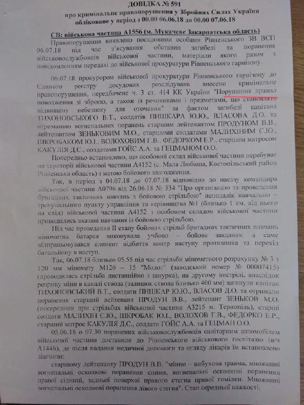 В справке №591 сообщается, что прокурором военной прокуратуры Ровенского гарнизона в ЕРДСУ внесено  криминальное правонарушение по ч. 3 ст. 414 "Нарушение правил обращения с оружием..."