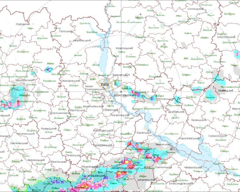 На карте видно, что области дождей (синие и красные участки) сосредоточены к востоку от Киева - щупальца дождя протянулись из Полтавской области, также дождливо в Черкасской и Винницкой областях.