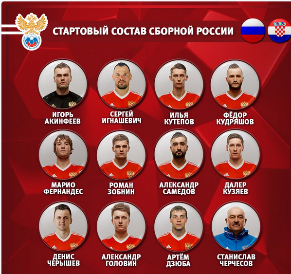 20.07  Тренер сборной РФ Станислав Черчесов вывел стартовый состав по стандартной для него модели 4-2-3-1. Кудряшов заменяет Жиркова на левом фланге. Схема годится и для атаки, и для обороны.