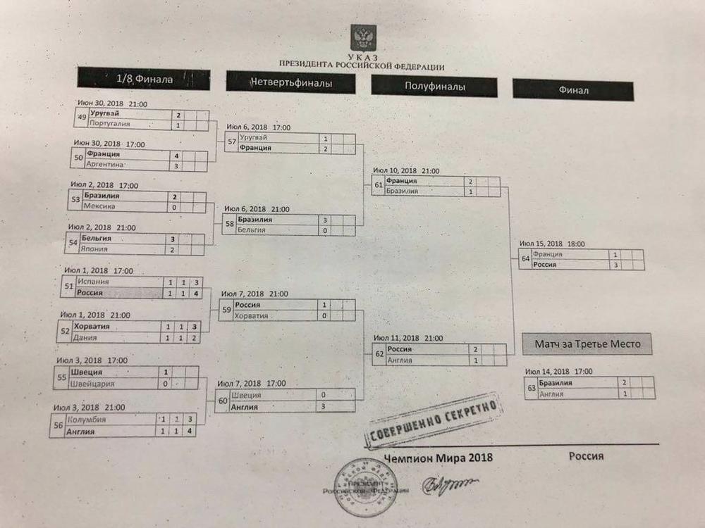 В Сети шутили, что издан "секретный указ" о результатах всех игр ЧМ-2018 с участием России. Которая, разумеется, побеждает везде и потом - в финале.